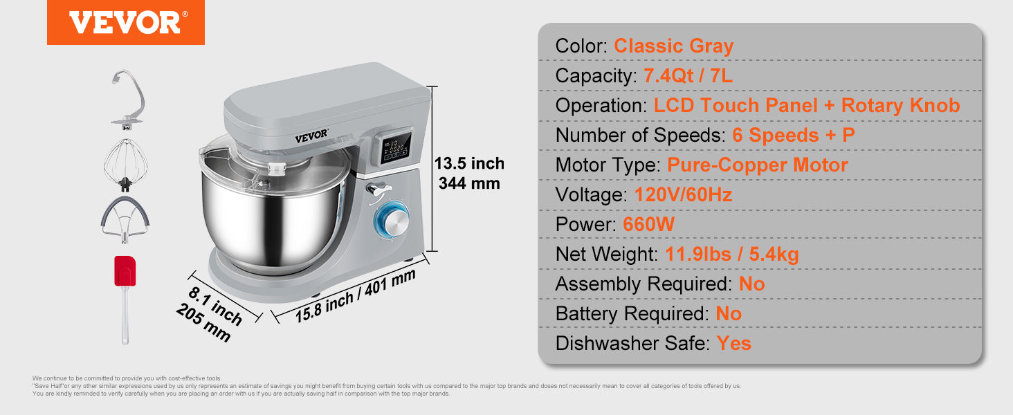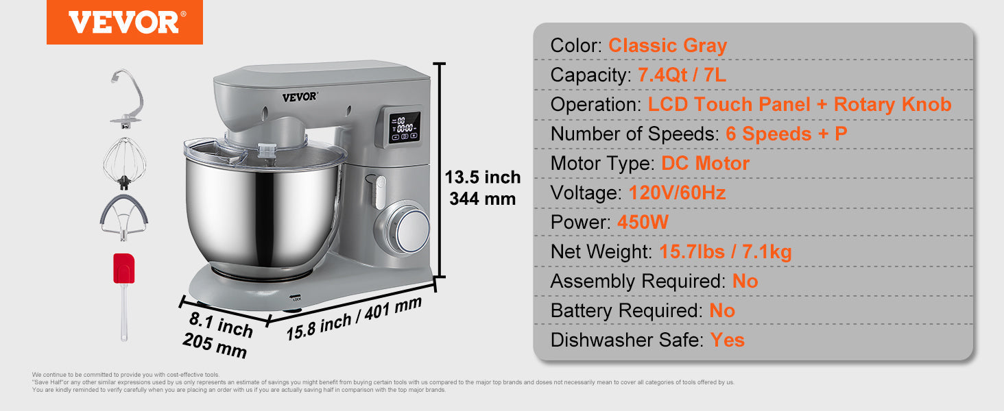 Never Worry About Mixing: Are you ready to mix! Don't stop! The planetary mixing and stirring mechanisms greatly contribute to full contact between the beater and the bowl's inner wall. The flat beater is designed with a soft silicone edge, which can effortlessly scrape off the sticky ingredients on the bowl and then mix them together. It doesn't even matter if they are left on the sides or at the bottom. Don't hesitate to knead dough and various bakery essentials with VEVOR's commercial mixer.