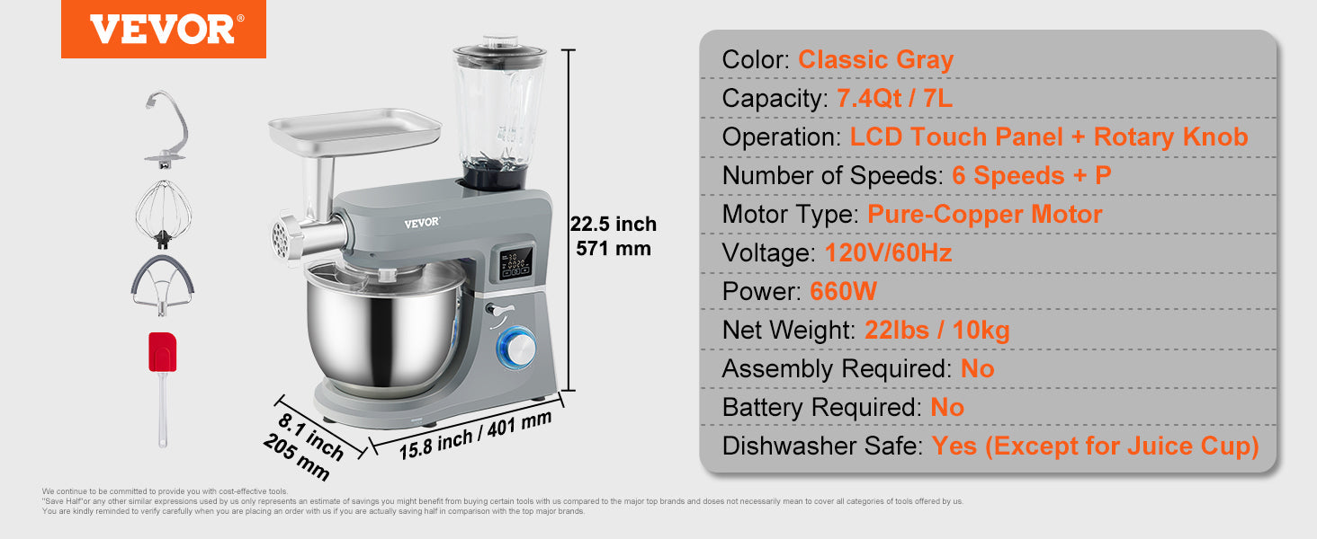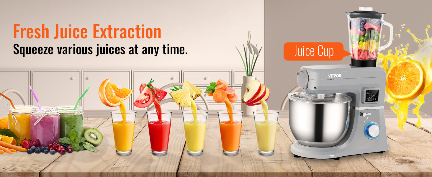 Complete Accessories for Outstanding Performance: Everything you need to create the perfect mix is included. Our planetary mixer comes with 3 attachments (all dishwasher-safe): a dough hook to knead flour, a beater to mix butter & mashed potatoes, and a whisk to whip creams & custards. Thoughtful accessories like a scraper and splash-proof cover are also provided. Besides, you can extend its use with the front-mounted meat grinder and top-mounted juice cup. Get ready to enjoy effortless baking and food preparation with this compact kitchen all-rounder.