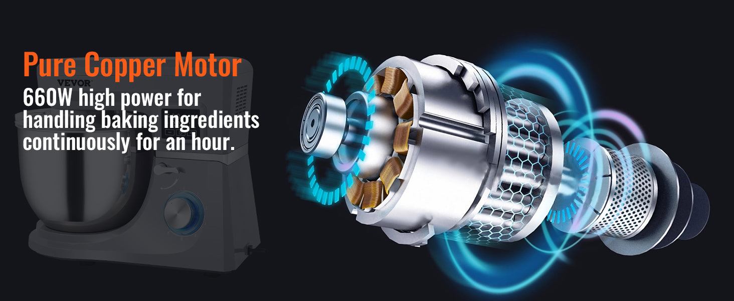 Unstoppable 6-Speed Pure Copper Motor: Choose how you mix! Equipped with a 660 W gear-driven copper motor, this mixer features continuous high-torque mixing, quiet operation, and outstanding reliability, standing up to the most demanding work in your kitchen. 6 speed levels allow you to perfectly mix different products at different speeds, from kneading dough slowly to whipping cream quickly. 1st-2nd speed for bread & cakes, 3rd-4th for butter & salad, 5th-6th for cream & egg white, and 6th can also be used for meat & juice. Start mixing like never before.