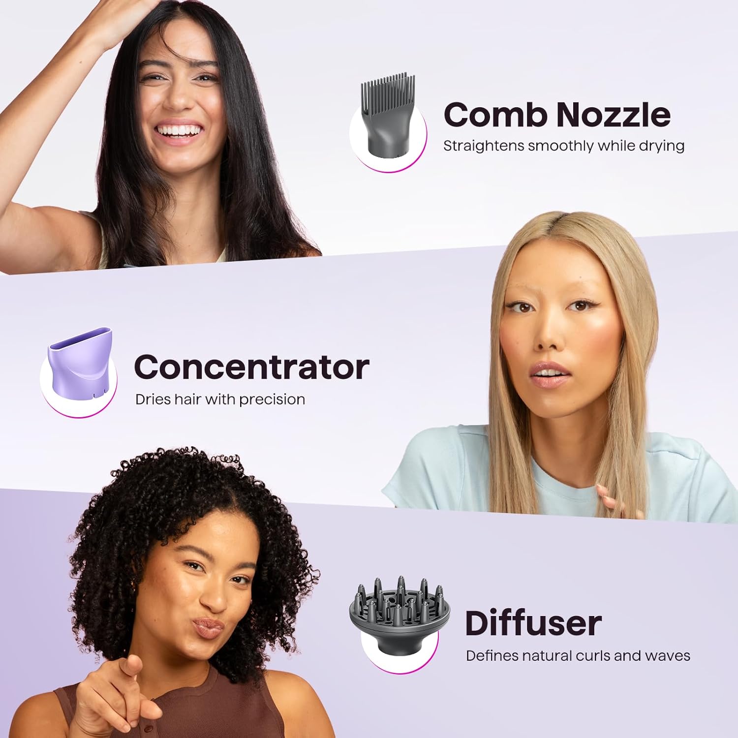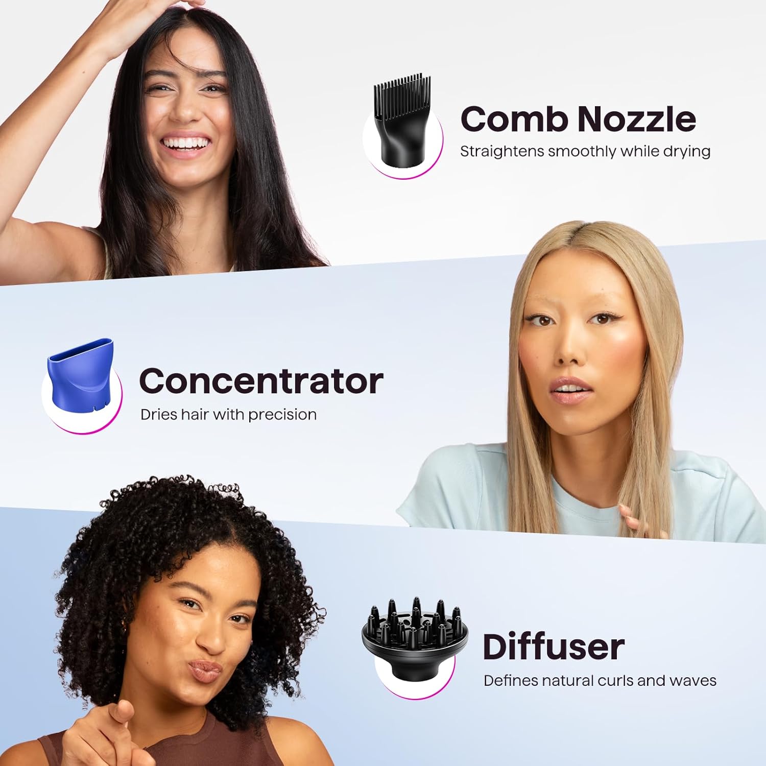- 3 Attachments for Every Style: A concentrated nozzle delivers precision airflow, allowing for targeted styling and greater control. The diffuser reduces frizz while enhancing and defining natural curls or waves. The comb attachment smooths and straightens, making it perfect for managing thick, unruly hair with ease.