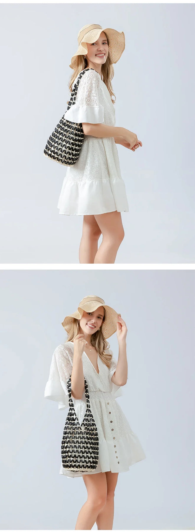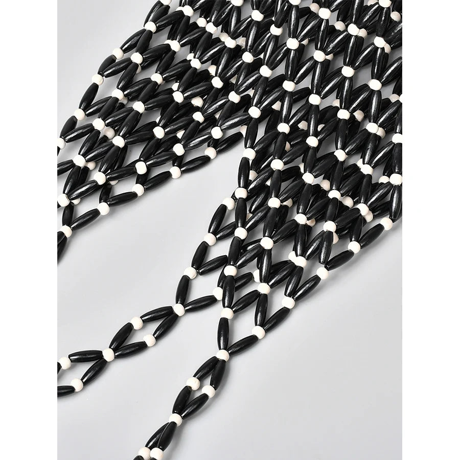 Women Woven hand bag summer design hollow-out wooden bead tote bucket shoulder bag female Reticulate netted canvas beach handbag