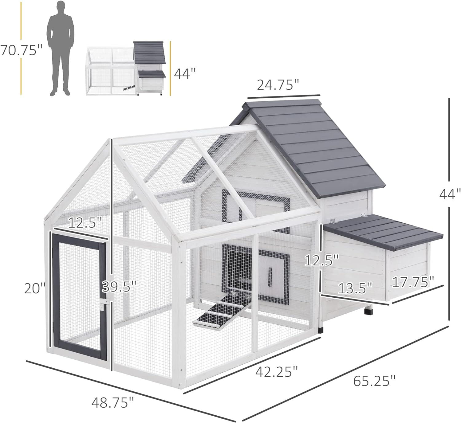 - 1. SPACIOUS OPEN DESIGN FOR FREE MOVEMENT - Measuring 5.4 feet in length and 4.1 feet in width, the Poultry Cage offers ample open space ideal for one chicken to roam comfortably. A detachable structure allows the run box and main house to be used separately, adding flexibility and convenience for both setup and cleaning.