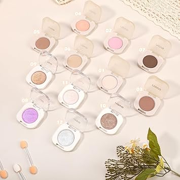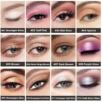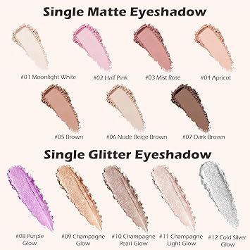 - 【Smooth Matte & Glitter Eyeshadows】This single eyeshadow is available in 12 stunning colors, with natural matte and dazzling glitter shapes. The Matte Colors are #01 Moonlight White, #02 Half Pink, #03 Mist Rose, #04 Apricot, #05 Brown, #06 Nude Beige Brown and #07 Dark Brown, and the Glitter Colors are #08 Purple Glow, #09 Champagne Glow, #10 Champagne Pearl Glow, #11 Champagne Light Glow and #12 Cold Silver Glow. Each comes with a smooth applicator brush, perfect for creating natural or glamorous eyeshadow looks