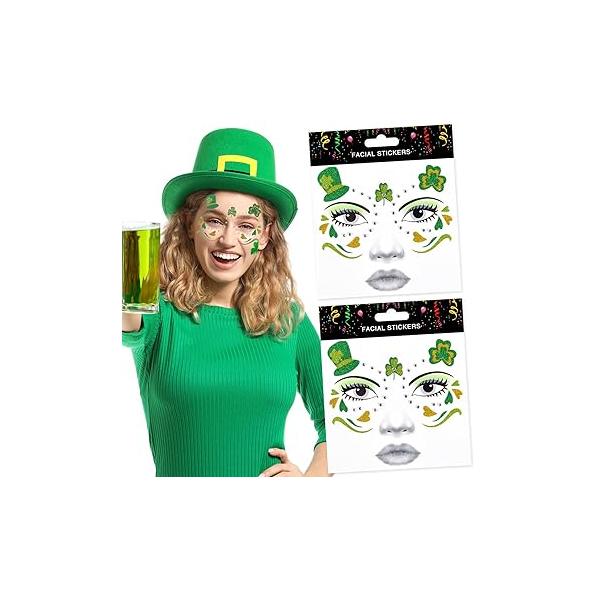 Cute Clover Face Stickers Green Clover Glitter Face Jewel Sticker St. Patrick's Day Clover Face Sticker Decal Body Face Self-adhesive Sticker Party Cosplay Decoration 2pcs