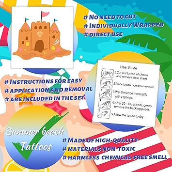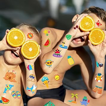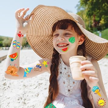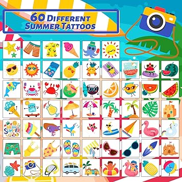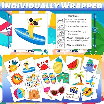 Set includes 240 Pcs Summer temporary tattoos in 60 designs. You can use them as beach pool party gifts and decorations, as well as classroom gifts gag stuffers, matching game. It also works on surfaces like mirrors and glass to add a festive touch.