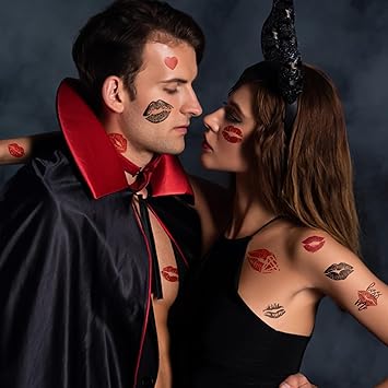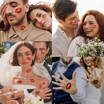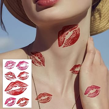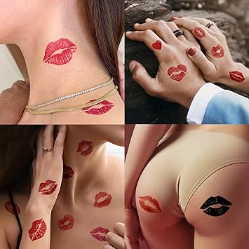 12 Sheets Red Kiss Temporary Tattoo Stickers, Lip Heart Print Face Tattoos, Waterproof Black Mark for Valentine's Day Costume Accessories Birthday Party Decoration