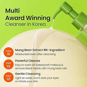 • [Gentle but Powerful Cleanse] :A lightweight, refreshing cleansing oil infused with mung bean extracts that effortlessly melts away waterproof makeup like mascara, sunscreen, lipstick, and eyeliner—without irritating your eyes or skin. Effectively removes pore-clogging impurities, leaving no sticky residue.