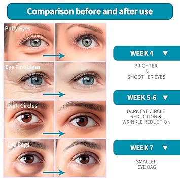 • 【Puffiness under the eyes and Dark Eye Circles Remover, Reduce Wrinkles】In a study of 98 users, 97% had Smaller Eye Bags in 5 weeks, and 92% of users had brighter eye area after 4 weeks., 87% saw Dark Eye Circles reduction after 6 weeks.85% saw Wrinkles reduction after 7 weeks.