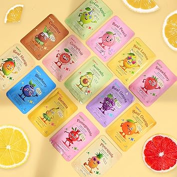 • 【126 Pack Face Mask Set】Our kids face mask skincare set contains 14 various kinds of facial masks,there are 9 sheets in each mask,including strawberry,pineapple,apple,grapefruit,orange,coconut,banana,mango,peach,pomegranate,blueberry,avocado,lemon and grape.Every facemask will provide you with a fresh and different experience daily