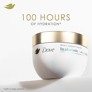 Meet Dove 10-in-1 Hyaluronic & Moisture Hydration Mask. Now every time you blow-dry or straighten your hair, this hydrating hair mask will literally renew it. Perfect for dry, damaged hair this mask delivers 100H of hydrated hair in 1 use. This Dove hair treatment for dry hair is the last step in our 3-step repair regimen: use Dove Daily Moisture Shampoo first to hydrate hair; Dove Daily Moisture Conditioner to smooth; and this weekly deep conditioning hair mask to soften and hydrate. Enriched with Hyaluronic Serum, this hair mask for dry, damaged hair deeply nourishes and strengthens the hair’s structure. So, there is no need to stress about damage, and you can feel good about your new look and new you. This formula also features Liquid Bio-Protein Care, designed to regenerate hair protein strength and refill with 1 trillion protein builders with every wash. This Hyaluronic & Moisture deep conditioner and hair moisturizer for dry hair has 10 transformative benefits in just 1 use. It delivers 100 smoothness; boosts hydration; visibly moisturizes; restores hair fluidity; delivers weightless nourishment; softens; leaves lasting bounce; gives extra shine; softens ends; controls frizz. After using Dove Daily Moisture shampoo and Dove Daily Moisture Conditioner, apply this hair hydration treatment generously into damp, clean hair from mid- length to ends and massage upwards. Let the rich formula work for 1 minute and then rinse. Use this conditioning hair mask once a week or more if your dry hair needs extra moisture. As always, Dove hair products are vegan and PETA approved, meaning it’s not tested on animals globally. Dove repairs her hair damage and seeks to join her on her journey towards healthier, stronger hair. with 3 step system