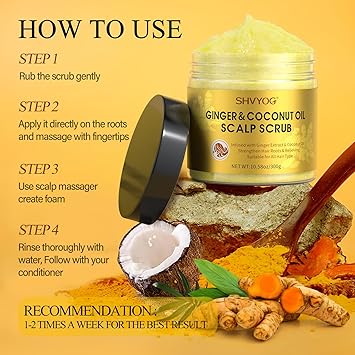 • 【GINGER SCALP SCRUB】This 2-in-1 ginger (turmeric) scalp scrub is designed specifically to gently exfoliate the scalp and reduces dandruff, relieve itch, strengthen hair roots, making sure the scalp stays clean and flake free. Leaving scalp refresh and hair nourished