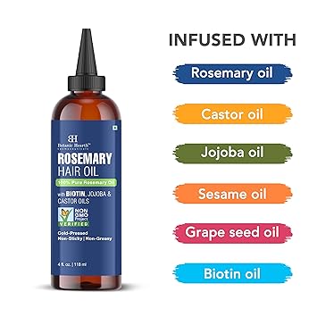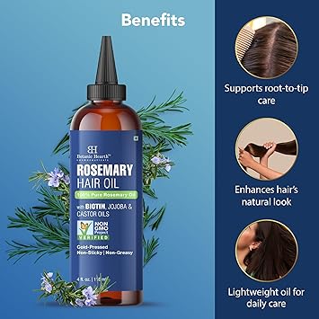 Botanic Hearth Rosemary Oil for Hair Growth |100% Pure, with Biotin, Jojoba & Castor Oils | Cold Pressed, Non-Greasy, Non-Sticky For Scalp Care 4 fl oz / 118 ml
