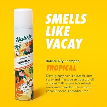 Take your hair from flat to fab with Batiste Tropical Dry Shampoo. This waterless shampoo targets excess oil and grease at the roots to breathe new life into your hair, leaving you feeling clean between washes. Batiste Tropical Dry Shampoo has a happy and summery scent that gets you ready to face the world, while dreaming of vacation. The Batiste Tropical spray locks in subtle, exotic scents of coconut, vanilla, and jasmine that never overpower. Batiste Dry Shampoo instantly makes your hair feel clean and fresh by removing oil, and provides added body and hair texture to give the appearance of fuller hair. Perfect for the girl-on-the-go, using this vanilla, jasmine and coconut dry shampoo spray helps save time by making styling your hair fast and easy. Let's face it, life gets crazy sometimes and skipping a wash (or two) is inevitable. Using this dry shampoo spray is easy. Shake the shampoo bottle thoroughly, section your hair and spray as much as you want 12 inches from your roots, use your fingertips to massage the Batiste shampoo into your hair and brush or style your hair however you want so you can get going. With Batiste Dry Shampoo, you can be confident your hair looks great no matter what life throws your way.