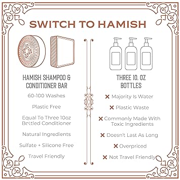 • Environmentally Conscious Hair Care: Hamish & Co. is committed to sustainability. Our solid shampoo uses all-natural ingredients to repair and condition hair while minimizing environmental impact