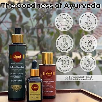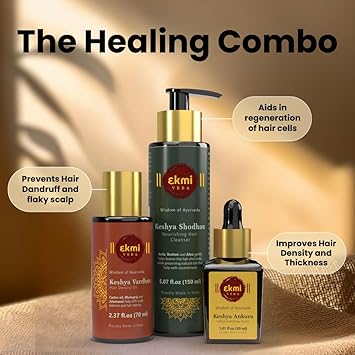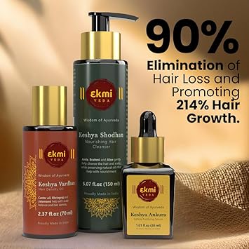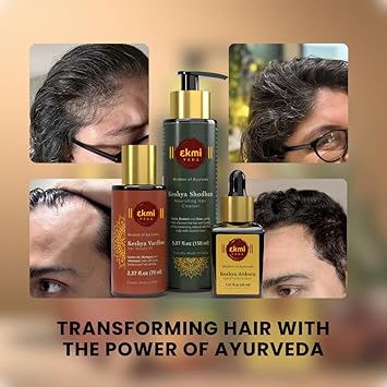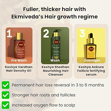 Introducing Ekmiveda's (Formerly Known As Muniveda) customized Hair growth combo set of 3 featuring i) Ekmiveda's overnight hair growth serum powered with Redensyl, procapil, capilia longa along with potent ayurvedic herbs like Bhringraj, Brahmi, Amla, ii) along with Ekmiveda's sulfate free shampoo infused with reetha, shikakai, eclipta alba for their anti hair fall and hair thickening properties which should be used after applying iii) Ekmiveda's Prewash hair growth oil with a potent blend of castor oil, rosemary oil, argan oil, coconut oil, bhringraj, amla, brahmi, almond oil for hair loss treatment and hair regrowth. For best results and visible results use this combo set regularly for atleast 3-6 months.