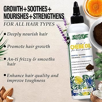 • CHEBE OIL: Chebe powder is a combination of herbs from Chad in Africa.The nutrients in chebe have a powerful super moisturizing and hydrating effect on hair. All natural, It has been used for centuries to lock in moisture and promote hair growth