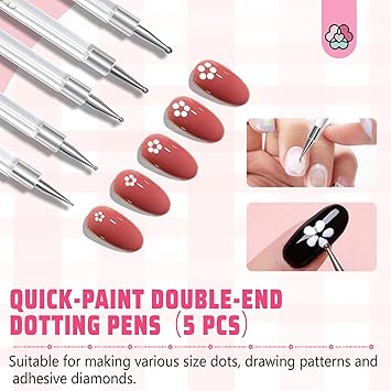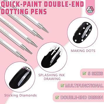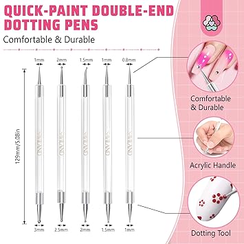 - 5PCS Double-Ended Nail Art Tools: The set of dual tip dotting pen tool features 6 different diameters(0.8/1.0/1.5/2.0/ 2.5/3mm), offering a variety of tip sizes to meet diverse painting needs, making it easy to create exquisite and charming nail designs, and create a wide range of nail art styles.