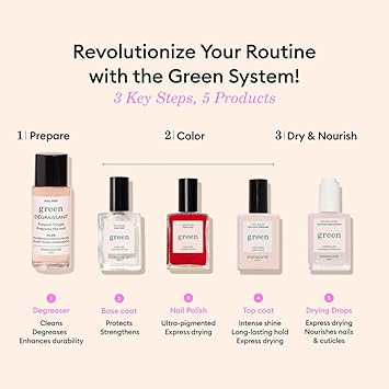 • Drying Drops cut the drying time of Green nail polish in half. The natural solvents in the product contain volatile compounds that allow the polish to dry twice as fast. The quick dry formula has a gentle floral scent and intensely nourishes the cuticles thanks to argan ceramides that strengthen the skin barrier.