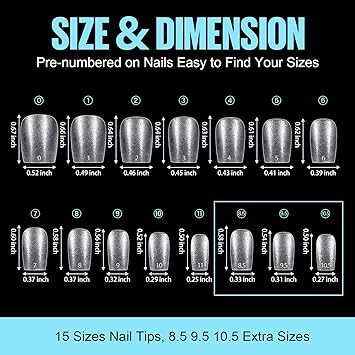 • 【15 Sizes, 450Pcs】Extra short nail tip has 15 sizes of nail tips totaling 450 pieces. In addition to the common 12 sizes, we have added 3 additional sizes so you can find the best size nail tips. The gel nail tips are marked with numbers at the top to help you find the suitable tips more easily.