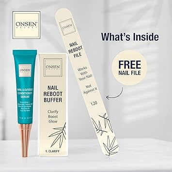 Onsen Secret Cuticle Cream Bundle, Double Sided Nail File 120/180 Grit, Oil - Japanese Natural Healing Minerals Care Serum. (15ml + Buffer File)