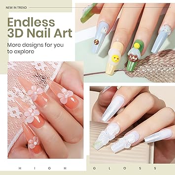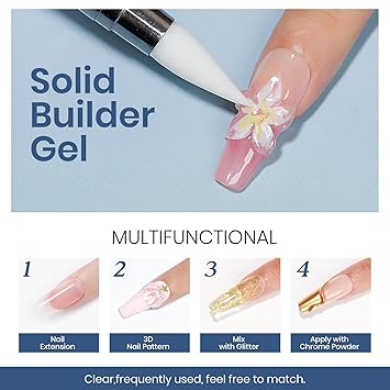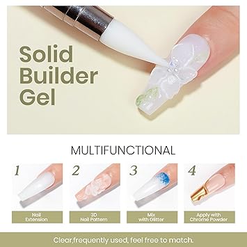 - Quick Extension & Funny 3D Nail Art: The building gel for nails is soft and good operability. Just need 3 steps to get nail extension: take gel with nail forms, spread evenly, press on nails and cure under nail lamp. Also easy to do 3D nail art, use silicone pen to carving, or 3D mold to get 3D patterns. Endless nail art awaits you to create.