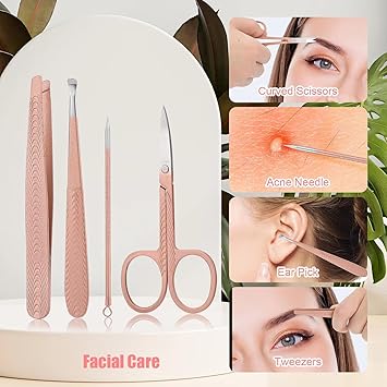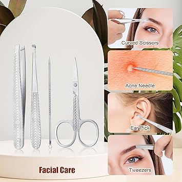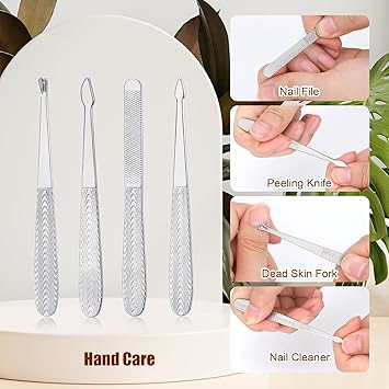 - 【Complete Manicure Pedicure Facial Care Set】A ingrown nail cutter,large nail clipper,medium nail clipper,slanted edge nail clipper,nail file,peeling knife,dead skin fork,nail cleaner,curved scissors,acne needle,ear pick,tweezers.There are instructions for each tool In the pictures.