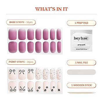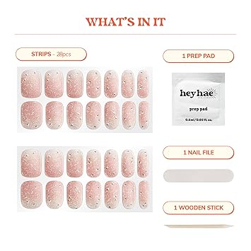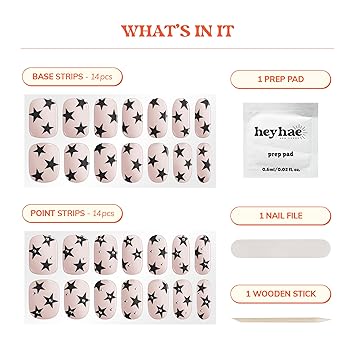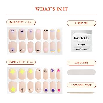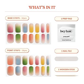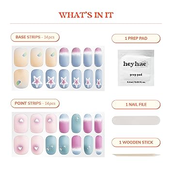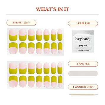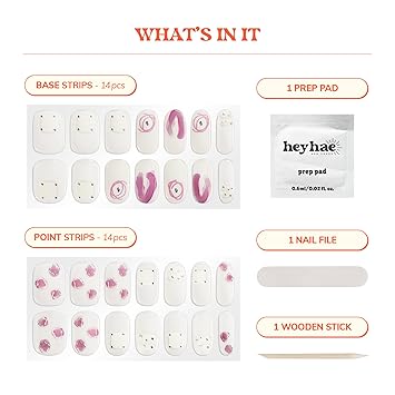 • Enjoy a complete package of fresh salon quality nails done at ease everywhere and anywhere you go! Package includes: 28 strips, 1 Prep pad, 1 Nail file, & 1 Wooden stick.