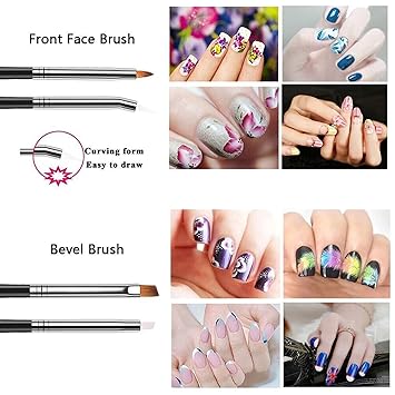 • 15pcs Nail Art Brushes Set: 2 Flat Fan Brushes; 1 Angled Head Brush; 1 Pattern Brush; 2 Liner Brushes; 3 Flat Brushes; 3 Oblique Brushes; 1 Dotting Pen Brush; 1 Drawing Brush; 1 Petal Brush. Covers the range of brushes you'll need, different brushes for different functions, some for dotting flowers, and others for drawing lines or painting.