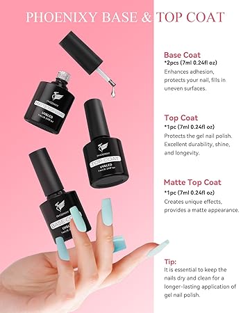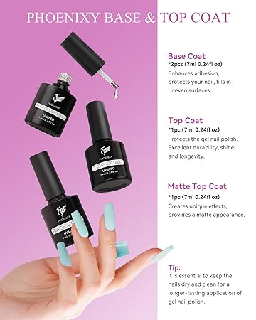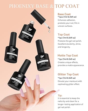 - [120 Effects of Colors]: Phoenixy gel nail polish kit includes 7ml glossy top coat,7ml matte top coat and 7ml glitter top coat. You get two effects of color for the price of 1. You can switch the three effects at your leisure time without the hassle of going to a nail salon, saving your time and money.