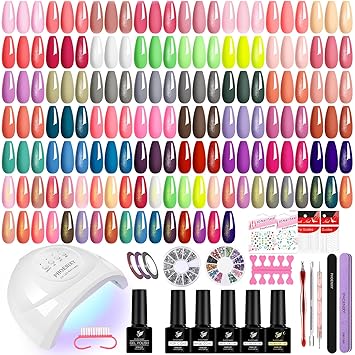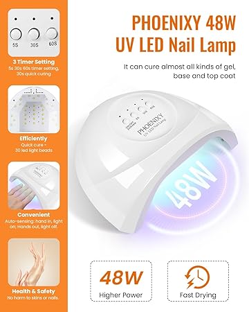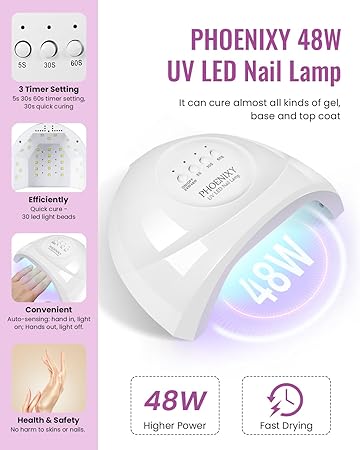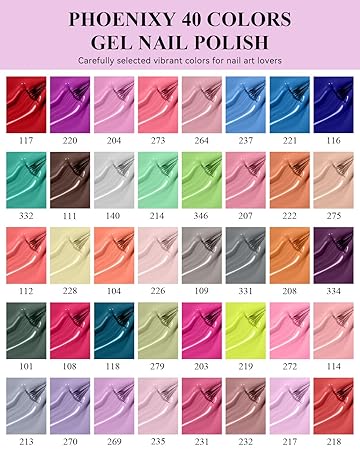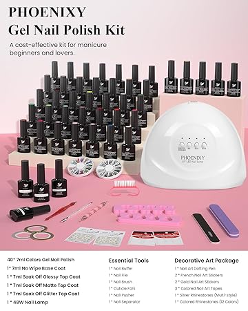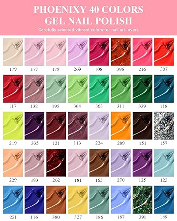 - [PHOENIXY Gel Nail Polish Kit with Nail Light]: 40 colors 7ml gel nail polish, 7ml base coat, 7ml top coat, 7ml matte top coat, 7ml glitter top coat, 48W UV Nail Lamp, nail decorations and other manicure tools. A cost-effective kit for manicure beginners and lovers. With some practice, you can get beautiful nail art for all seasons and occasions- parties, holidays, work or daily life.