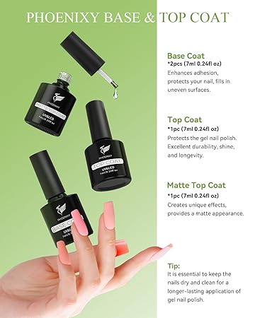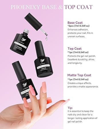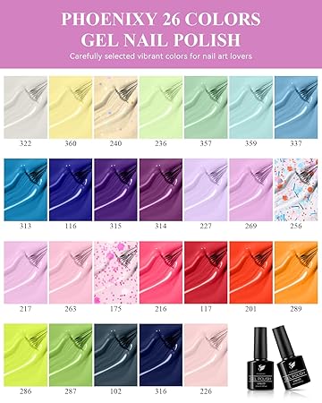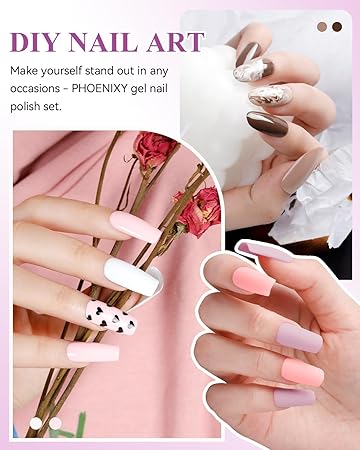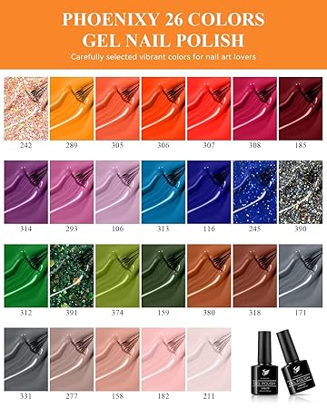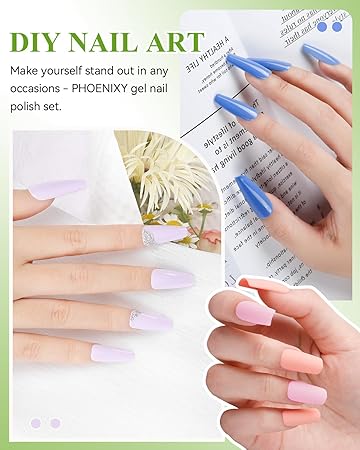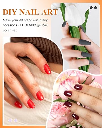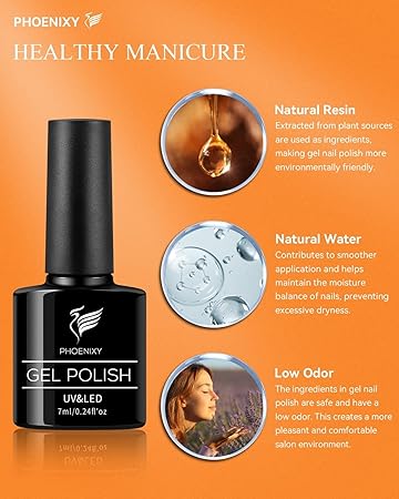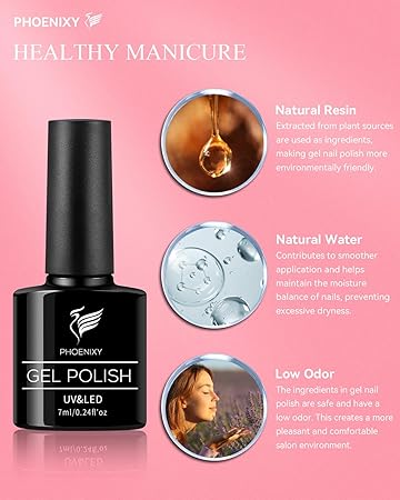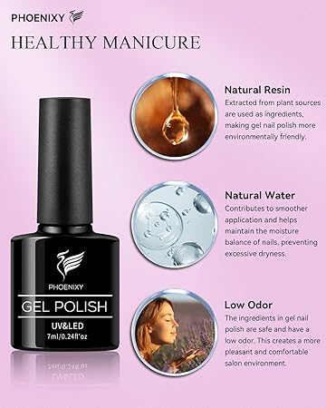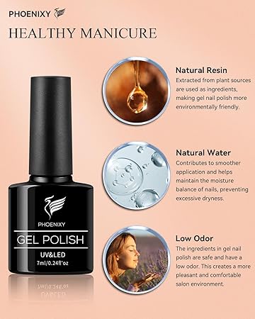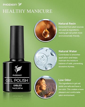 - [High Quality & Long Lasting]: Made of natural resin, Phoenixy gel nail polish contains botanical ingredients and lowest smell, harmless to skins or nails. The higher quality promises better adhesion and gloss, smooth application, and strong color-locking ability. The nail polish can last more than 3 weeks with proper application (keep your nails clean with file and buffer before applying base coat).