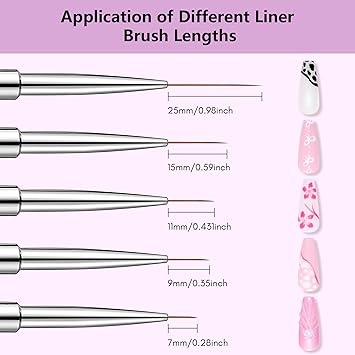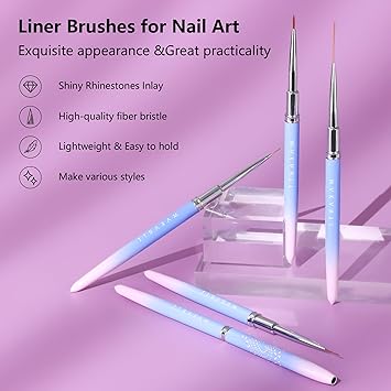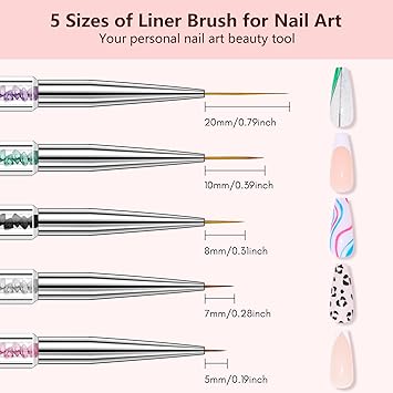 - SOFT AND THIN NAIL LINER BRUSH: These nail art liner brushes are specially for nail art diy detail design, painting like drawing lines, flowers, french nails, ripples, geometric figures, and other nail patterns with painting gel polish, or doing ombre nails with colored gel nail polish, or 3D nail art with builder nail gel.