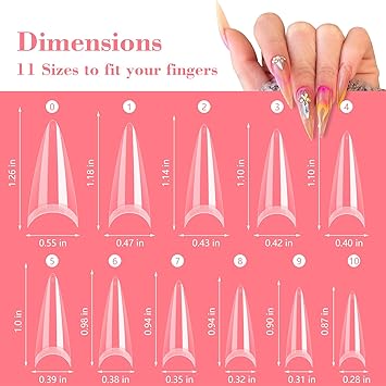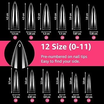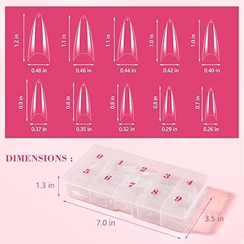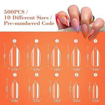 - 【Box Design】A total of 500PCS of short clear almond shaped nail tips in the package, 10 different sizes for you to choose from, the size numbers are 0-9, which can meet your various fake nails art needs. They are well stored in separate inside the box, you can easily mark and track, you can better find the right size.
