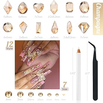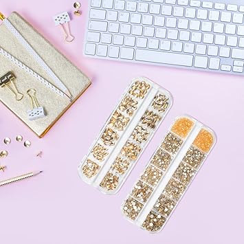 • 【2 Boxes 24 Grids Crystal Champagne Gold Nail Rhinestones + Stainless Steel Tweezer + Pickup Pen】4080Pcs Sparkling Champagne Gold rhinestones nail crystals. Including 12-shapes crystal rhinestones, multi-sized round crystal gem rhinestones. Enough amounts and more shape options for your daily work, go out or other decoration purposes. Comes with 1 Stainless Steel Tweezer and Pickup Pen for Manicure DIY Decoration at Home Salon Supplies.