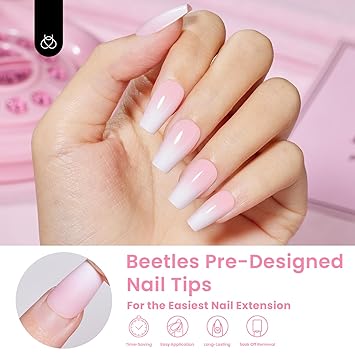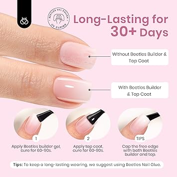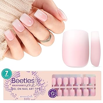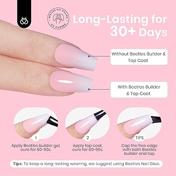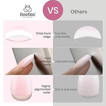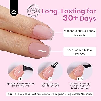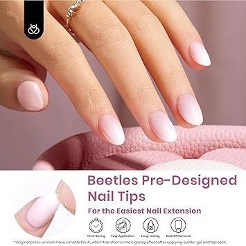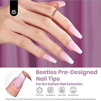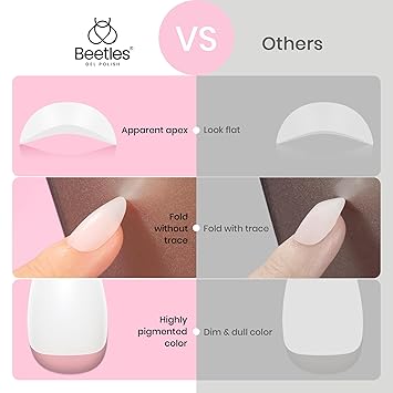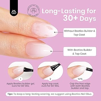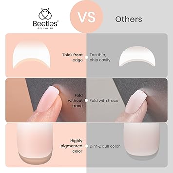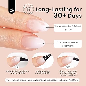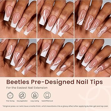 - 【Time Saving Use 】How to apply? ①Choose the right size; ②Apply with UV gel nail glue, cure for 60-90s; ③(Optional)Add you nail design; ④Apply top coat and cap the free edge, cure for 60-90s. (Recommended to use with Beetles uv nail glue and top gel, need to be purchased separately)