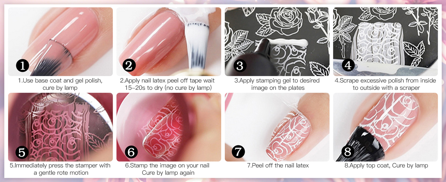 • 【Nail Stamper Kit】2PCs Nail Stamp Plates + 4PCs Stamping Nail Gels + 1Pc Nail Art Stamper + 1PC Replaceable Transparent Nail Stamper Head + 1PC Nail Scraper. We have detailed instructions If you feel it difficult to transfer, try to practice a few times or contact us.Stamping Nail Polish Gel-4 Colors black, white, golden,silver. Nail art stamping gel is super pigmented and saturated with nice consistency. 'NOTE' Need UV Lamp Curing!