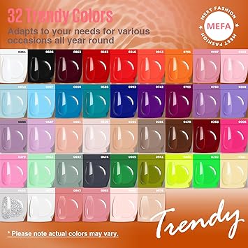 - 32 Colors Classic Set:The gel polish set has rich color intensity, covers all shades needed in the nail art process, from classic black, white, and red to various tones of pink, green, purple, and blue