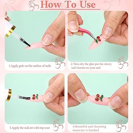 - Easy to use:Whether you are a beginner or a professional in nail art, fruit nail art decorations can be used easily and save you a lot of time. Apply nail gel or nail polish on nail, then put these shiny nail jewelry studs on the nails, cure them under UV/LED light, pretty and cute nail art finished. Cherry nails supplies for nails are easy to use on natural nails and false nail tips to create your own glitter and unique nail art.