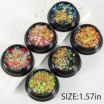 - 【PACKAGE CONTENT】6 Boxes mixed type nail decoration + 1pc wax pen rhinestone picker + 1pc curved nippers tweezers.