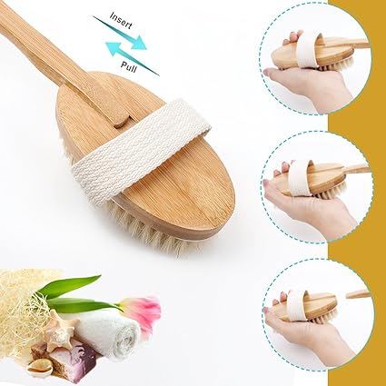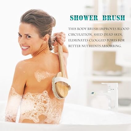 Bath Body Brush & Shower,Dry Skin Brushing with 100% Natural Boar Bristles 16 inches Long Bamboo Detachable Handle,Back Scrubber for Exfoliates Stimulates Blood Circulation-by Qlben
