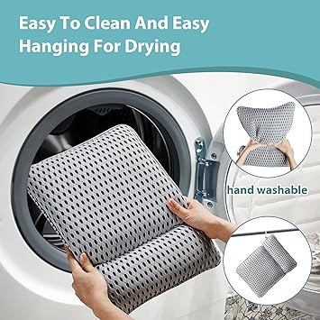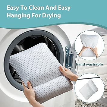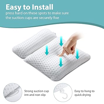 - MACHINE WASHABLE AND EASY TO STORE: This pillow is very easy to wash or hand wash with mild detergent, aslo the bath cushion has a built in hook which can be used to hang the pillow on a towel rack or bathrobe hook in your bathroom or shower for fast and easy air drying.