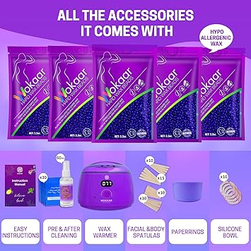 • COMPLET KIT: Alongside the wax warmer with digital display the kit includes 5 wax bean bags, 15 large, 10 medium & 20 small waxing sticks, 1 pre-wax spray and 20 after-wax wipes bag, 10 protective rings, 1 silicone bowl and instructions.