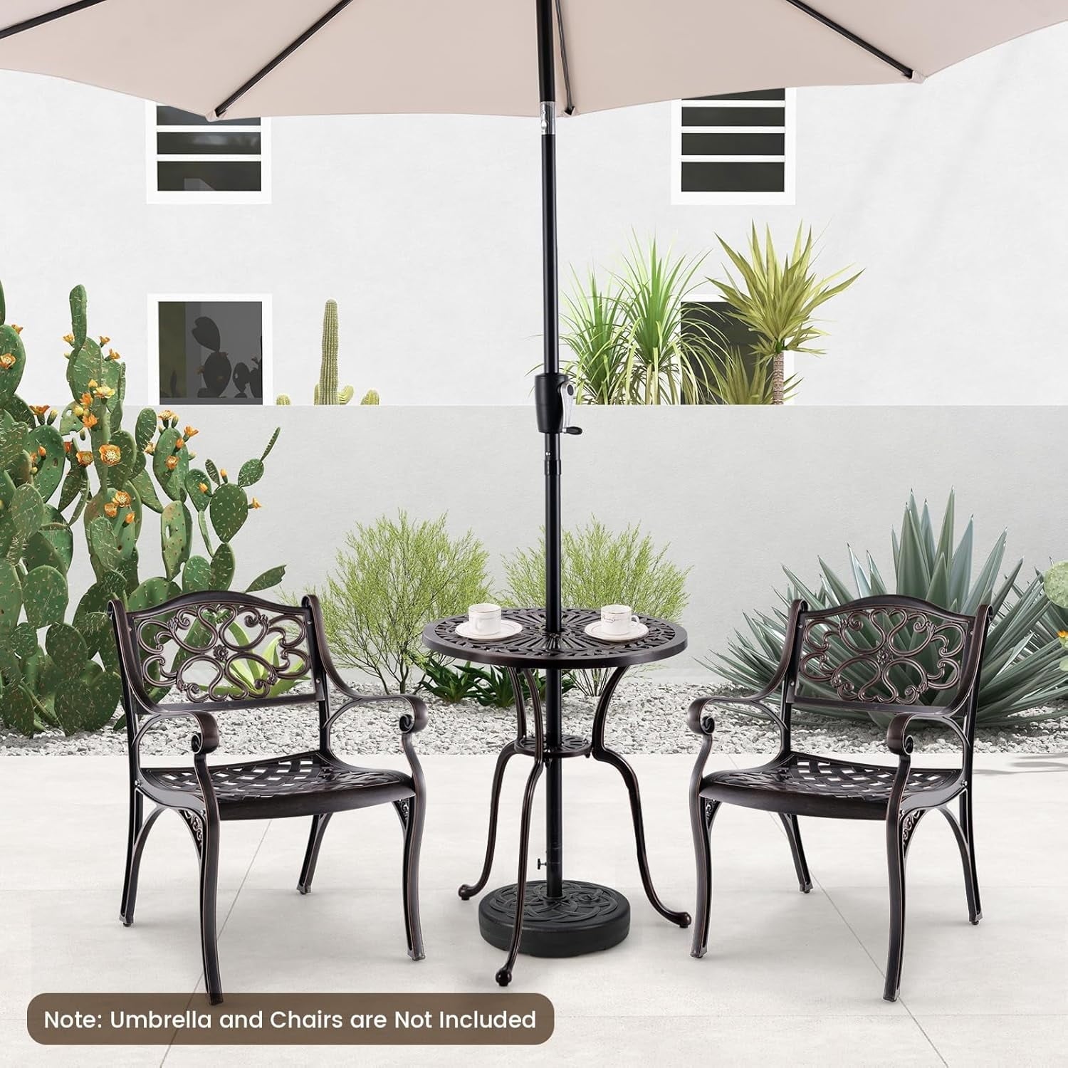 Crafted for longevity, the robust cast aluminum construction with powder-coated finish ensures high stability and durability. The 2-inch hole in the middle accommodates your umbrella, ensuring you savor every meal in cool comfort. Its gracefully curved legs not only imbue a touch of sophistication but promise an unwavering foundation, further perfected by adjustable footpads for stability on any terrain. Moreover, the intricate designs transform your outdoor space into a haven of stylish dining. Elevate your outdoor gatherings with this cast aluminum table.