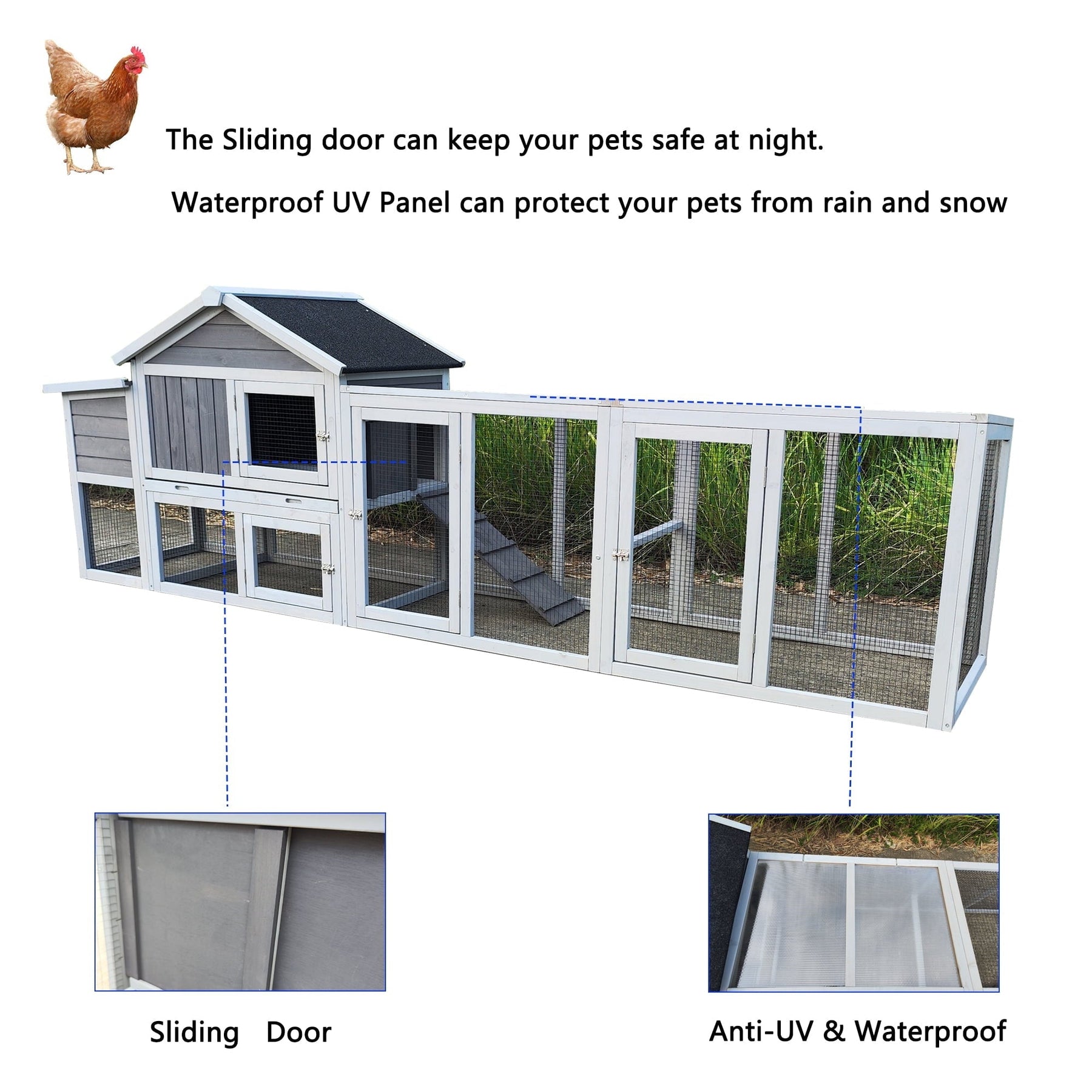 Give your hens a safe and spacious home with the Zephypaws 112' Large Wooden Chicken Coop. Made from solid fir wood with an eco-friendly waterproof coating and durable metal mesh, this outdoor chicken run is built to last. The anti-UV waterproof roof protects your flock in all weather. With 4 doors (including a secure nesting box door) and a sliding divider between rest and play areas, it’s designed for convenience and safety. The openable top makes egg collection easy, while the strong lock keeps predators out. Perfect for backyard farming, this hen house combines comfort, function, and protection!
