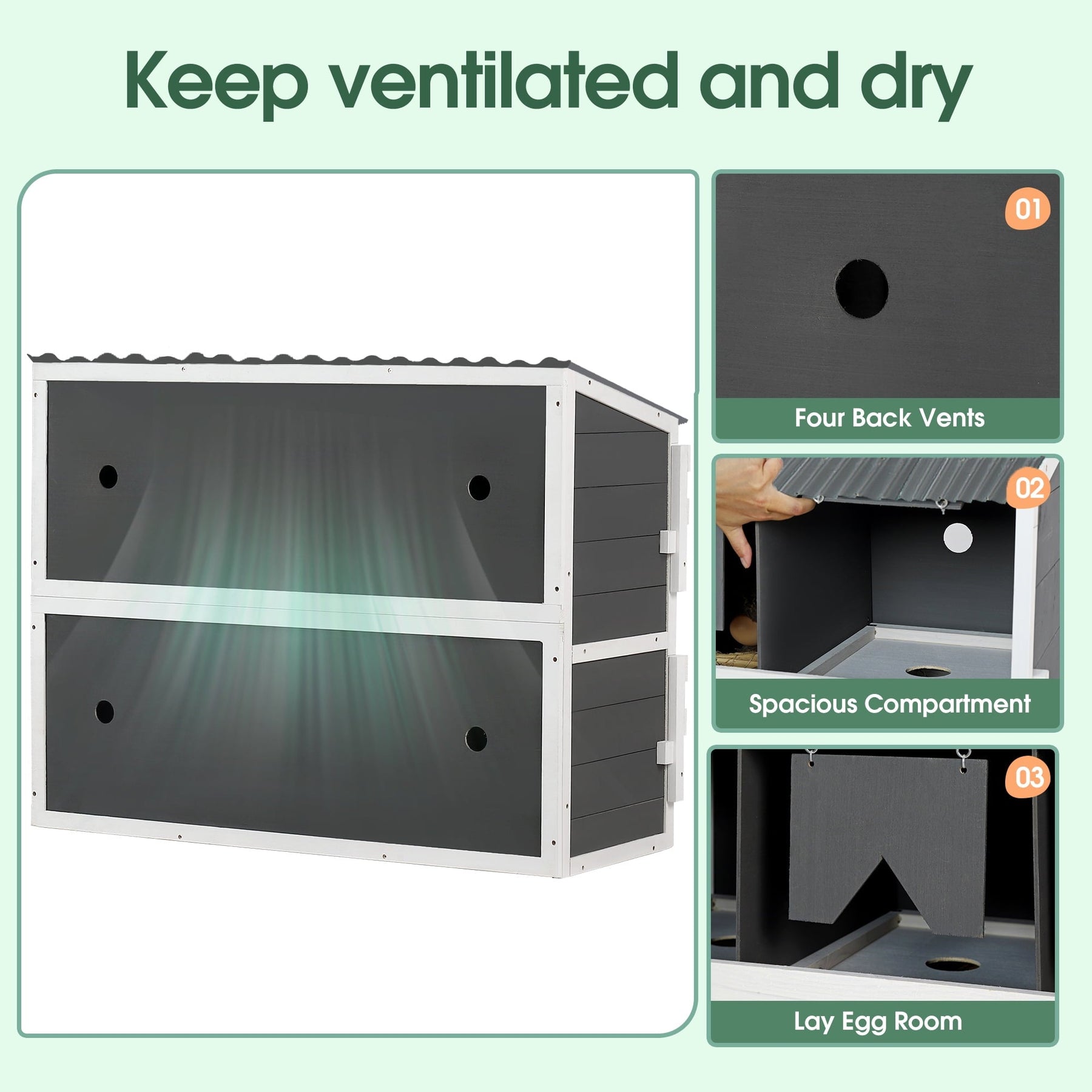 The chicken nesting box comes with roofing, protected hens from rain and sunlight, suitable for indoor or outdoor use. It provides hens with a comfortable and sheltered space to lay eggs, so they feel safe and secure, thus increasing their egg production rate.