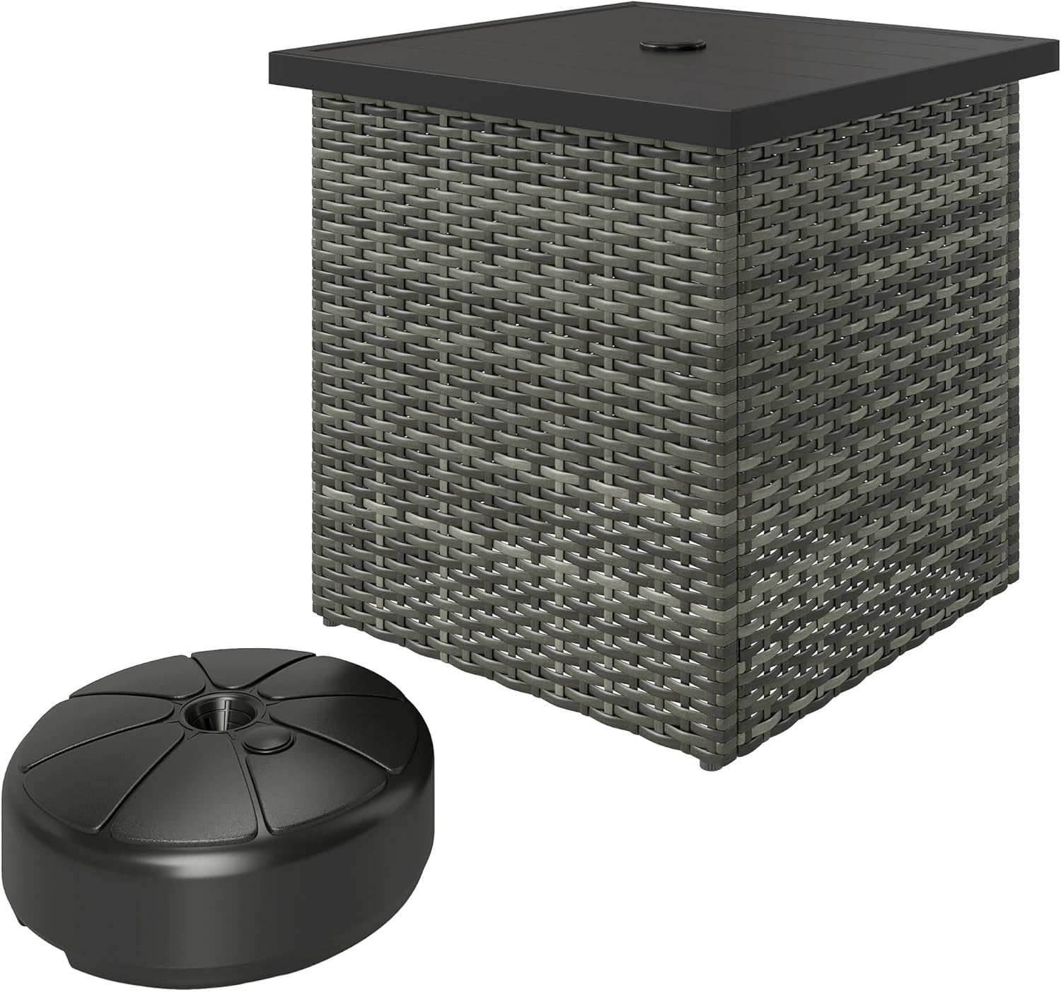Welcome! Discover the ZOPan All Weather Wicker Side Table—your perfect outdoor companion. Crafted with square PE rattan and a UV-resistant frame, this table features a 1.5' umbrella hole and built-in storage, ideal for patio, garden, poolside, or deck. Its durable design withstands the elements, while the sleek wicker finish adds natural charm. Use it to hold drinks, snacks, or decor, and enjoy shaded relaxation with the umbrella base. Simple, stylish, and functional—elevate your outdoor space today!